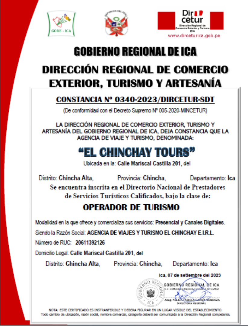 El Chinchay Tours nació en el corazón de Chincha, con la visión de ofrecer una manera única de experimentar la región. Fundada en 2023, nuestra agencia surgió de la pasión por compartir la riqueza cultural, histórica y natural de Chincha con el mundo. Desde entonces, nos hemos dedicado a diseñar y organizar viajes que van más allá de lo convencional, sumergiendo a los viajeros en auténticas experiencias que celebran la herencia local y fomentan conexiones genuinas con la comunidad.